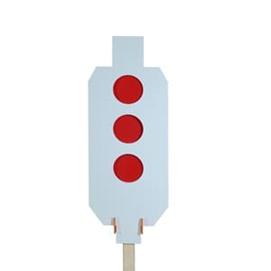 Triple Dueling Tree – 10″ x 21″ 3/8″ AR500 hostage target with three 3.5-inch holes with red 4.5 x 4.5inch head Shot silhouette paddle spinners.