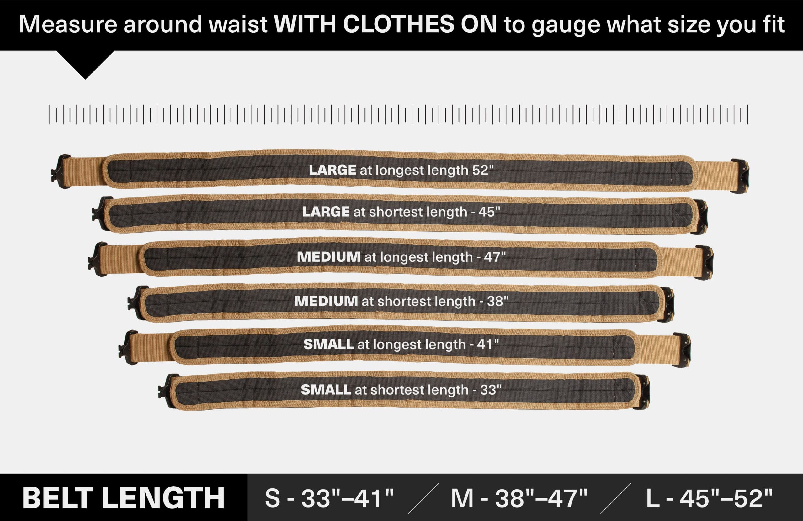 - Sizes | Small (30″-33″ Waist) (33″-41″ Belt Length), Medium (34″-39″ Waist) (38″-47″ Belt Length), Large (40″-46″ Waist) (45″-52″ Belt Length)