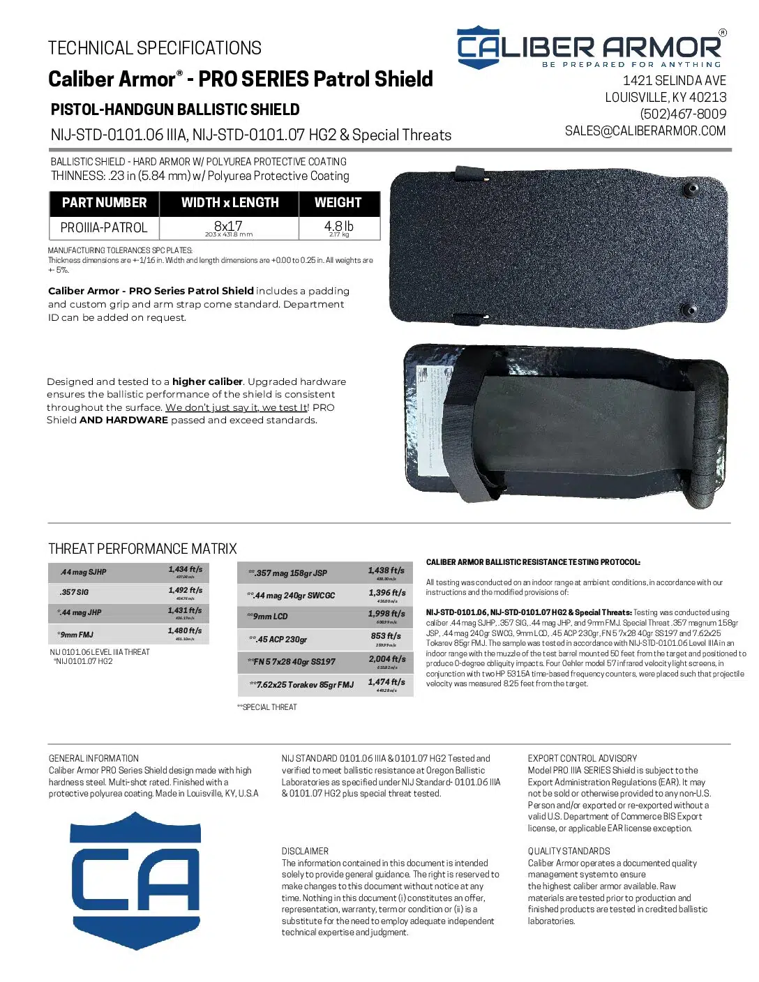 Caliber Armor IIIA Shield – PRO IIIA Series design made with ultra-hard alloy. Multi-shot rated. Finished with a polyurea coating. Made in the U.S.A