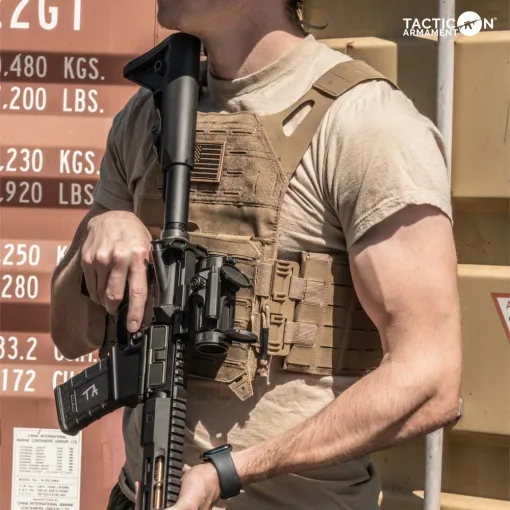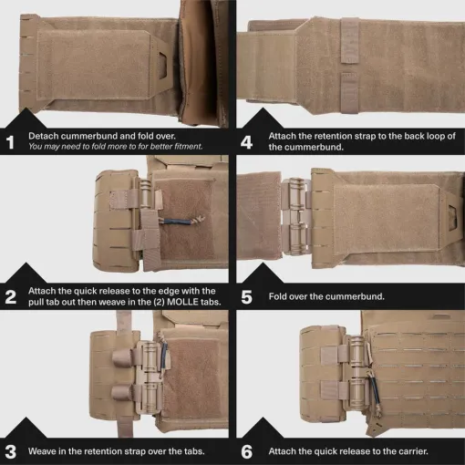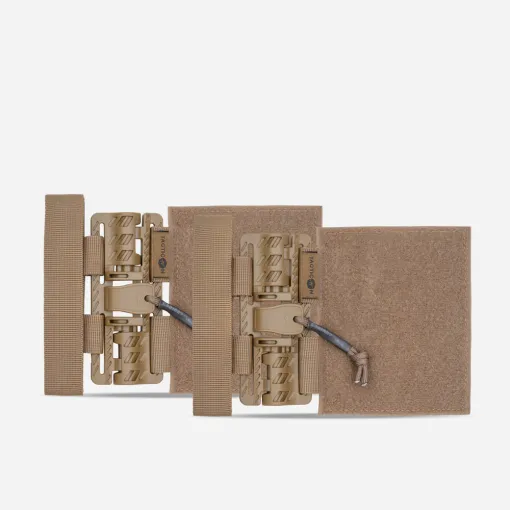Tacticon’s Quick Release Cummerbund Conversion Attachment is a quick and cost-effective upgrade to your existing vest. The Velcro portion of your cummerbund folds inward to expose the leading edge of your MOLLE attachment. The MOLLE portion of the quick attach mechanism is then attached and includes a wrap around strap for extra securement. The second connecting piece will rest in place secured by Velcro under your front flap. The result is a modernized QD carrier eliminating the hard tearing of Velcro, noise and time consumption while donning your vest. Simply connect the QD mechanisms for a secure fit. To disconnect, pull down and out on the quick release tabs.