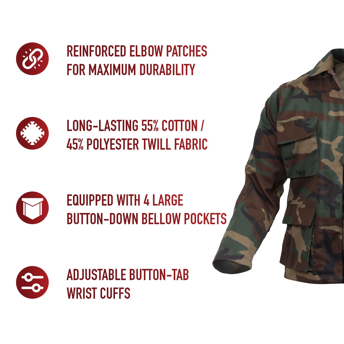 Inspired from the functionality and practicality of American military attire, our Twill BDU and Digital Camo Shirts are designed to tackle the roughest outdoor elements while providing comfortable all-day wear and adaptability. These button-down shirts are the real deal and can handle whatever you throw at them. Tried-and-True Reliability: These tactical shirts feature reinforced elbow patches for maximum durability that endures wear and tear while protecting your arms. The double-stitched seams provide extra strength and years of reliable use, while the front button-flap closure shields you from outdoor debris. High-Capacity Utility Pockets: The long sleeve shirt comes equipped with four large button-down bellow pockets that expand when being used and stay flat when not. These front utility pockets are perfect for holding everyday essentials like your phone, wallet, keys, or multi-tool. Unparalleled Durability: Each military shirt is crafted with a long-lasting 55% cotton / 45% polyester twill fabric. This blend provides unmatched resiliency and easy-to-care-for maintenance (machine washable). These shirt jackets aren’t afraid to get down and dirty out in the wilderness. Supreme Comfort & Fit: The adjustable button-tab wrist cuffs allow you to adjust your sleeves as needed. These combat uniform shirts also incorporate button-tabs on the waist for a perfect fit. They can be worn as a shirt or jacket, making for a great shacket. A Full Set: Complete your uniform with a matching pair of our Tactical BDU Cargo Pants or Relaxed Fit Zipper Fly BDU Pants.